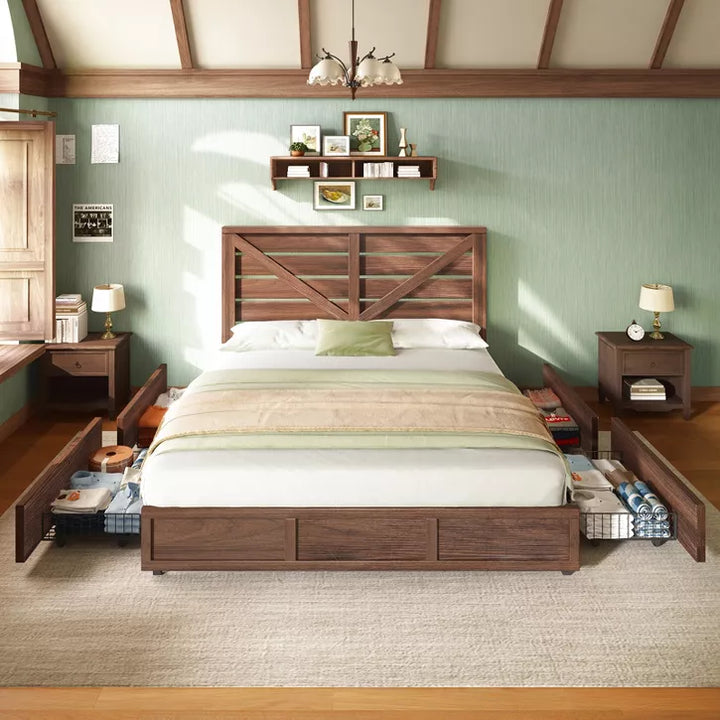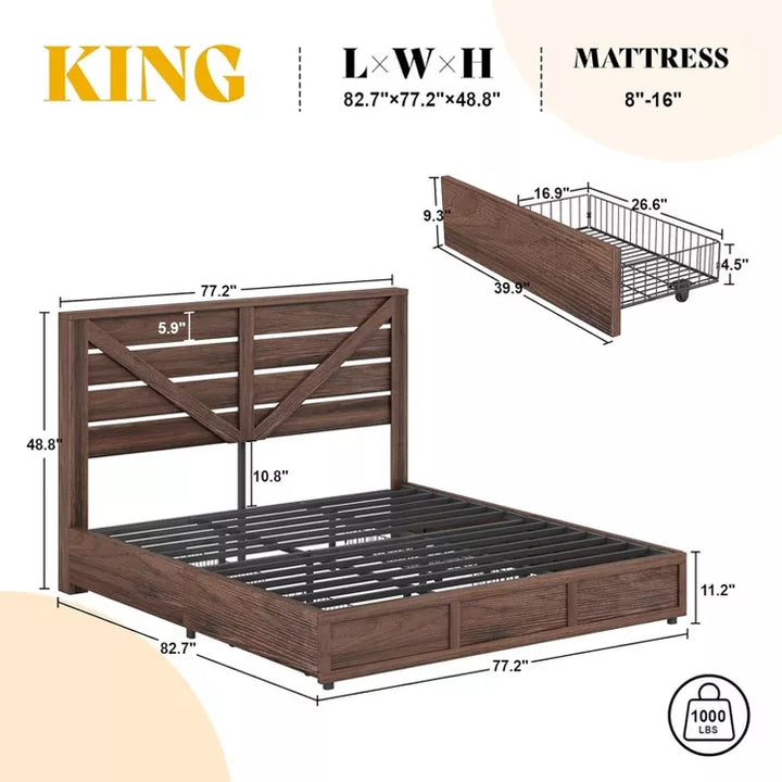 This farmhouse-style platform bed features a natural wood grain finish and barn-inspired headboard, adding rustic charm to any room. It includes four large lockable drawers with wheels for easy access and ample storage. The unique arrow-design headboard blends vintage and modern aesthetics, while the sturdy metal frame and central support leg provide strong support for up to 1000 lbs—no box spring needed. Easy to assemble in about 60 minutes, with responsive customer service for any issues.