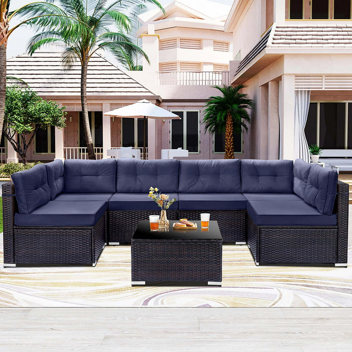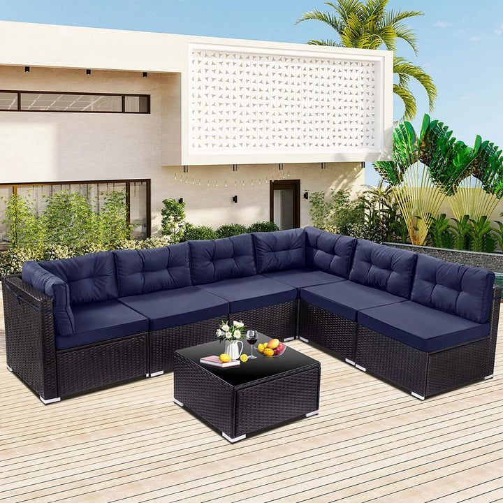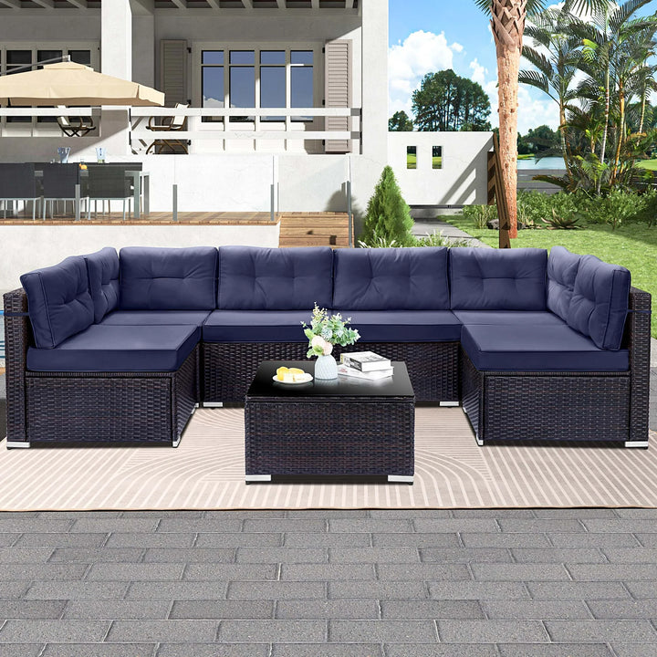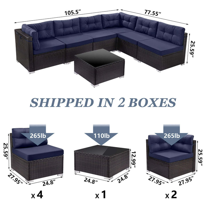 7 Piece Rattan Sectional Sofa Set with Cushions will be a good choice if you want to feel relaxed while eating lunch, reading a book or taking a nap. Our outdoor patio furniture set is designed for relaxation and parties. You can enjoy a coffee in the morning sun, tea after lunch and a beer at a party. Adopting high-quality PE rattan and iron frame that can last years to come. The thickened cushion for leaning, which can be easily removed and cleaned, provides you with the greatest degree of comfort. Properly using 7 components can combine different effects and takes you extraordinary experiences. Perfect for patio, garden, backyard, poolside, and balconies. You will like it so what are you still waiting for? We will lead you to experience unprecedented comfort and pleasure to be better at enjoying your leisure time.