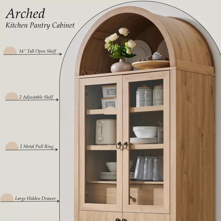 71" Tall Arched Pantry Cabinet with 4 Doors & Adjustable Shelves & Hidden Drawer, Modern Farmhouse kitchen Storage Cabinet