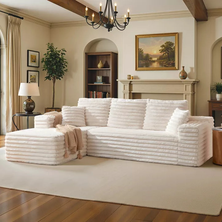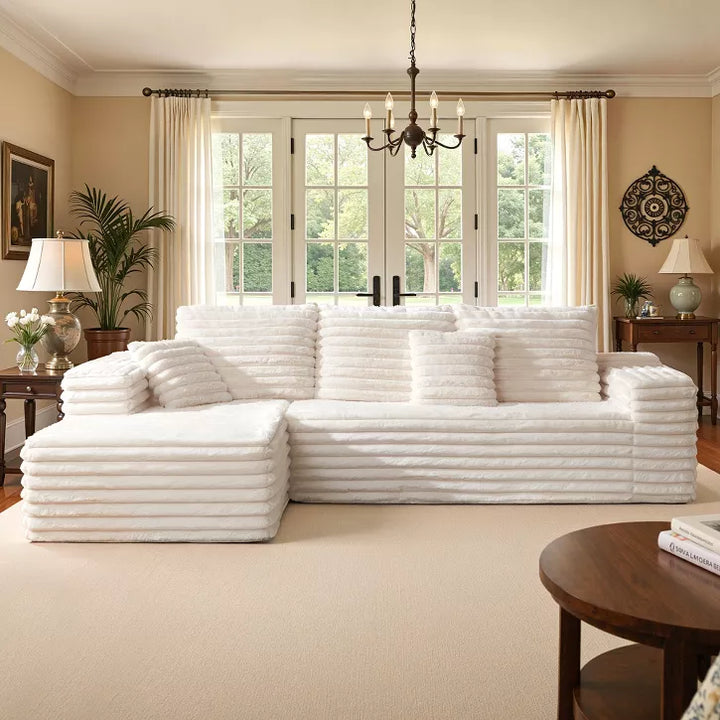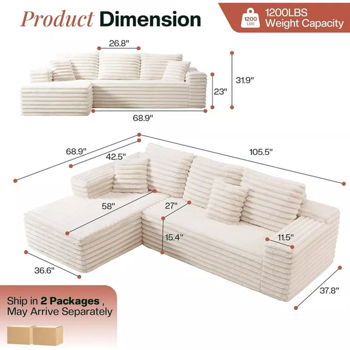 Upgrade your living room with this 106" modular sectional sofa — designed for comfort, durability, and modern living. Upholstered in plush corduroy, the oversized cloud couch feels soft and cozy while being breathable, wrinkle-resistant, and durable enough for everyday family use. Pet and kid friendly, it delivers both comfort and practicality. Built with 30kg/m³ high-resilience foam and durable pocket springs, the cushions offer a cloud-like softness with firm support that resists sagging over time. With a 27" deep seat, it provides generous space for tall individuals and families to stretch out, lounge, or nap in total comfort. The modular design allows each section to be moved freely, so you can create L-shaped layouts, double chaise lounges, or open seating to fit your space. Wide armrests and supportive backrest pillows enhance relaxation, perfect for reading, movie nights, or everyday comfort. Conveniently delivered vacuum-compressed, the sofa requires no tools or assembly. Simply unbox, let it expand for 48–72 hours, and enjoy your new favorite spot.