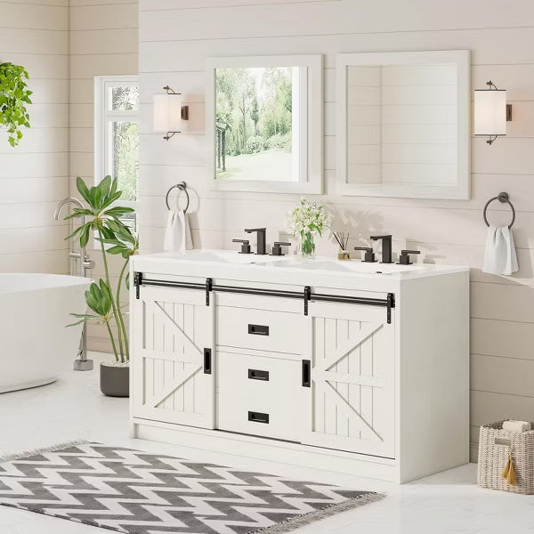 Introducing our 61-inch farmhouse-style double bathroom vanity with sink combo, featuring 2 sliding barn doors and drawers, 2 basins, and concealed metal handles. 1. **2 Sliding Barn Doors:** Smoothly slide open from both sides on steel tracks, adorned with a farmhouse-style wood grain finish. 2. **Large Size Dual Basin:** Sturdy and durable, with raised edges and 2 integrated sink designs for leak prevention. Smooth wide surface ensures easy cleaning. 3. **Partitioned Storage:** Spacious compartments behind sliding doors accommodate taller items, while two sliding drawers provide storage for standard-height essentials. 4. **Built-in Metal Handles:** Deep black metal grooves allow easy and secure opening and closing of doors and drawers. 5. **Easy Installation:** Clear and detailed instructions make installation easy to finish. Crafted from high-quality medium-density fiberboard for durability, this double bathroom vanity is built for long use. Upgrade your bathroom with functionality and style – order now!