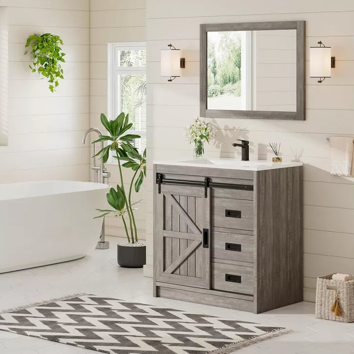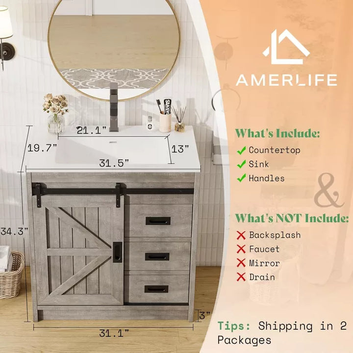 Farmhouse Style with Sliding Barn Door – Classic sliding barn door design with rustic wood grain finish adds a charming farmhouse look to any bathroom. Optimized Storage Space – Spacious cabinet and 2 drawers offer organized storage for daily essentials and taller items. Durable Metal Handles – Hidden black handles with deep grooves for easy and safe access, plus a waterproof finish to prevent rust. Upgraded Acrylic Countertop & Sink – Larger, integrated white acrylic sink with raised edges to prevent water overflow and simplify cleaning. Compact Design & Easy Assembly – Space-saving size perfect for small bathrooms; includes detailed instructions and quality MDF structure for long-lasting use. Bring both style and function to your bathroom with the AMERLIFE 31" Bathroom Vanity with Sink Combo. The sliding barn door design glides effortlessly along a durable steel rail, adding farmhouse charm and easy access from either side. Finished in light grey with a rustic wood grain pattern, it creates a cozy yet modern feel. With overall dimensions of 31.5" W x 19.7" D x 34.3" H, this vanity is ideal for smaller spaces. Made from premium MDF for stability and durability, it comes with clear instructions for a quick and simple setup.