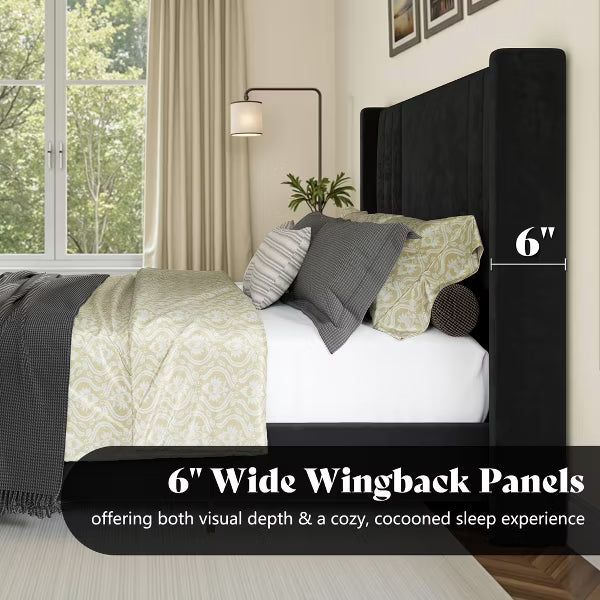 This elegant bed frame blends modern design with plush comfort, featuring a sleek wingback silhouette softened by vertical lines and deep channel tufting. Upholstered in buttery-soft, waterproof velvet, it offers easy maintenance while the generously padded headboard and footboard ensure luxurious relaxation. The sturdy platform base includes durable wood slats, eliminating the need for a box spring—simply add your mattress. Designed for convenience, it arrives in one box and assembles effortlessly in 30 minutes with two people, making it a perfect blend of style and practicality