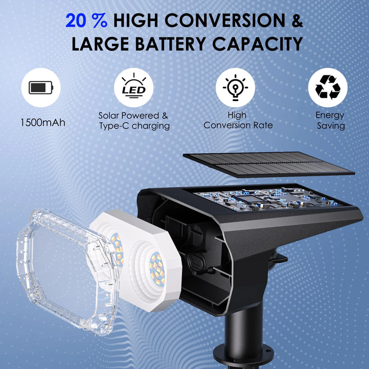 - 🌞🌞High Efficiency Solar Charging&USB C Charging: The solar spotlight equipped with a 10×5.5cm PET frosted laminated polycrystalline silicon solar panel (5.5V 0.7W), it offers 20% higher charging efficiency than typical solar panels. built-in 1500 mAh rechargeable batteries, 5-6 hours charging in sufficient sunlight, 6-12 hours of automatic lighting at night. Even in rainy days and winter, you can still use the USB C cable to charge the spotlight, you can use our solar landscape spotlight all year round without any worry!
