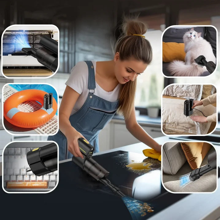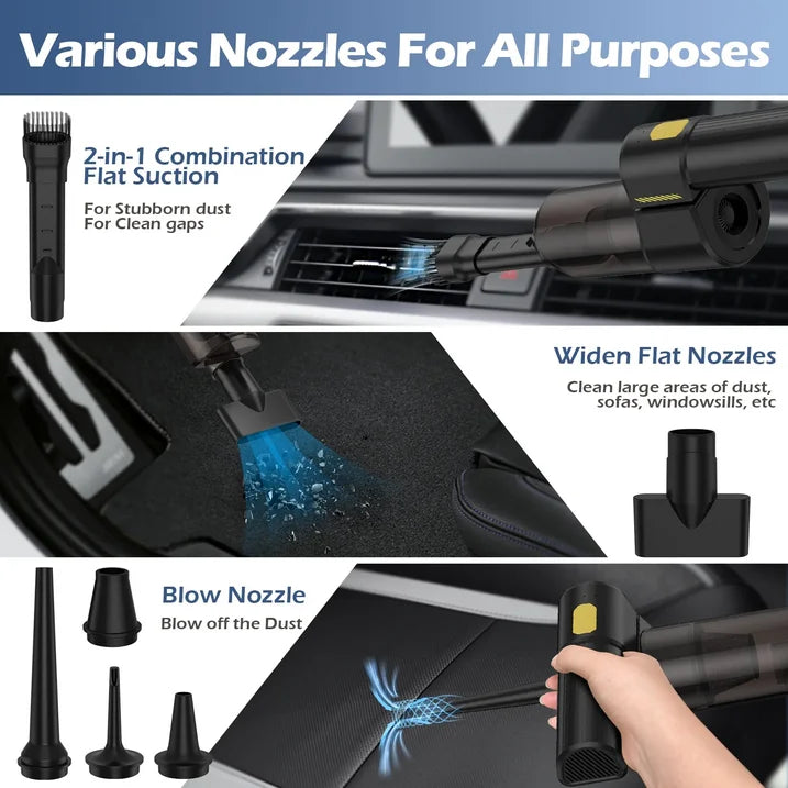 - Versatile Cleaning Accessories - New Featuring an innovative eight-in-one nozzle to meet various cleaning needs. The wide suction head efficiently cleans large areas, the brush tackles hair, and the vacuum inflation/blow function is suitable for inflating products and cleaning hard-to-reach areas. The flat nozzle aids in quickly drying hair. Additionally, the body can rotate 180 degree, and the front LED flashlight illuminates every dark corner for a more thorough cleaning.