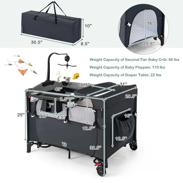 5-in-1 Multifunctional DesignThe Novashion baby crib serves as a changing table, bassinet, bedside sleeper, baby playard and activity center. The bedside crib function can provide baby with the needed comfort and comfortable sleep; Portable changing table make changing diapers become more comfortable and easier for new born family; baby bassinet playard function can provide a safe place for baby to sleep and play.