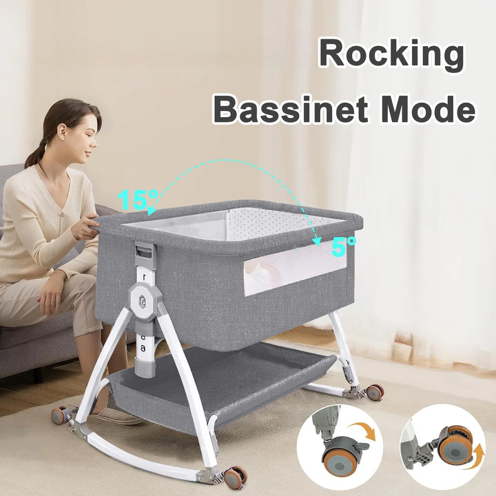 4 in 1 Bedside BassinetThe baby bed crib can be used as a stand-alone baby bed, baby bed with mosquito net, bassinet bedside sleeper attached to the adult bed by pulling down the side zipper, and can also be used as a rocking crib to mimic a parent's rocking motions, helping to soothe the baby to sleep, with no need to disassemble in the process of using and can be converted in several second.