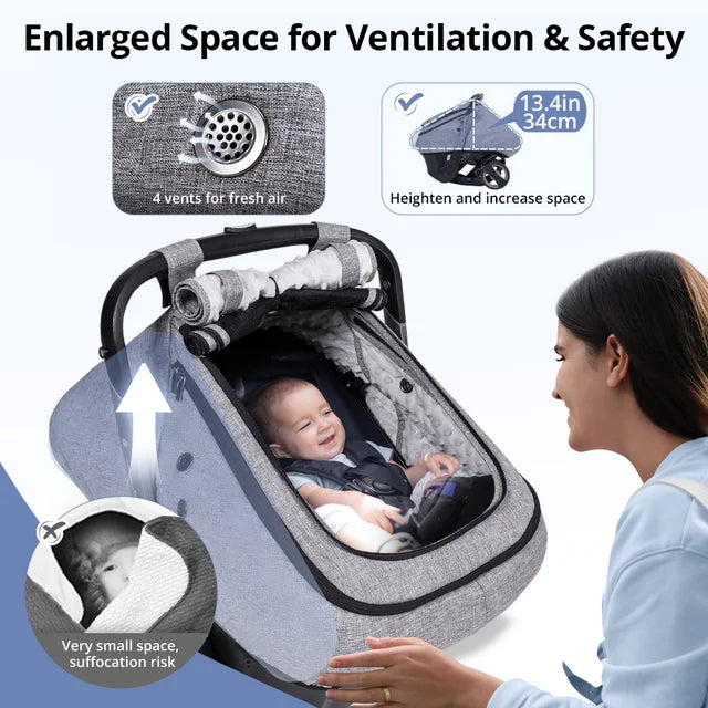 Enough air flow especially for newborn babies, our infant car seat cover with 4 ventilation holes for baby more safety when sleeping or close the layer, kick-proof and roomy structure to bring baby more comfortable and enough space. -