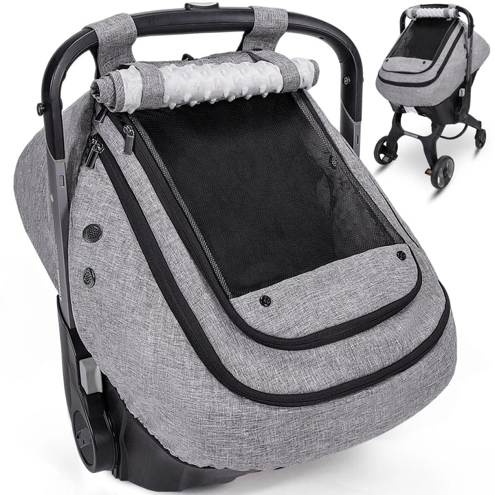 The infant car seat cover has two layers of windows which has 3 usage modes in different scene. Full open mode match with half zipper, easy to get Inside and out for babies; Breathable mesh window can see babies clearly; 360° fully coverage mode resists the cold wind, sunlight, rain. -