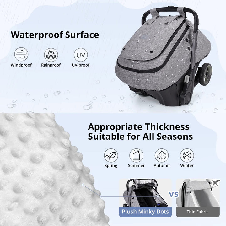 The surface of the baby car seat cover is made of high premium waterproof fabric. The inner layer with environmentally friendly cotton fabric, plush minky dots is soft and comfortable to your baby. Perfectly designed to keep your baby warm, cozy and shielded from harsh cold winter/ snowy/ rainy/ windy weather -
