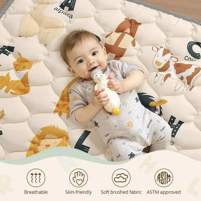 Our Novashion baby play mat, designed for comfort and safety. Made from soft cotton and sponge filling, it's 30% thicker than most other playmats, offering a cushioned play area. The odorless materials and non-slip silicone base ensure stability on any floor type. Measuring 50"x50", it fits baby playpens perfectly and provides ample space for tummy time, crawling, and playing. Foldable and portable, it's easy to store and great for travel. The 26-letter and animal patterns stimulate cognitive development, making it ideal for playroom, living room and bedroom.