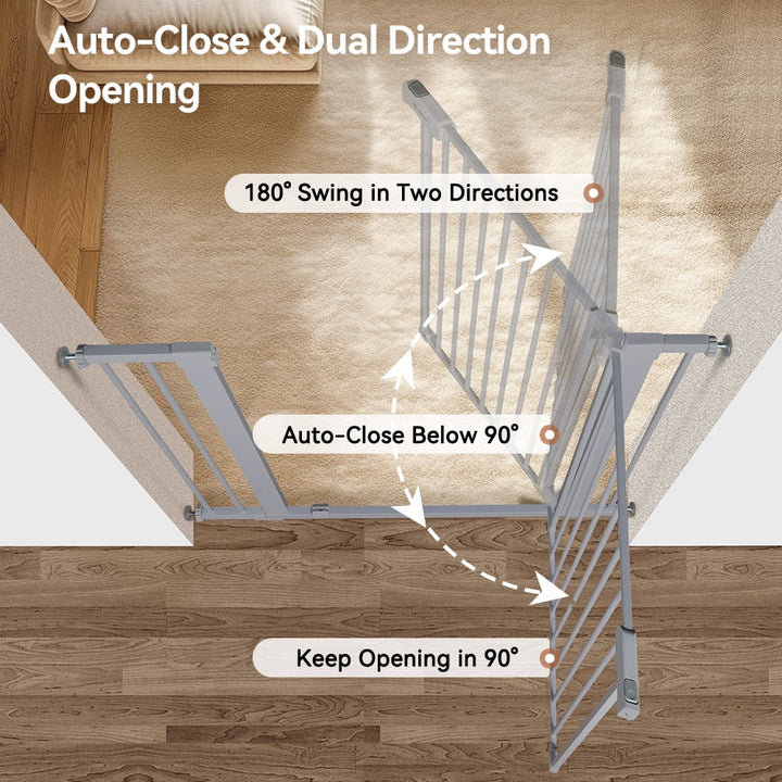 The Extra Wide Baby Safety Gate, standing at a height of 36 inches and adjustable in width from 29.5 to 40.6 inches, offers a robust solution for child safety in the home. The gate's heightened rails provide an added layer of security, effectively containing adventurous toddlers and pets within designated areas. The gate features an auto-close mechanism, providing added convenience for busy parents by automatically securing the gate after each use. Catering to larger doorways and openings, the gate's extra-wide design makes it versatile for various spaces within a household. Finished in a crisp, modern gray, this gate seamlessly integrates with modern home decor, offering both style and functionality for peace of mind.