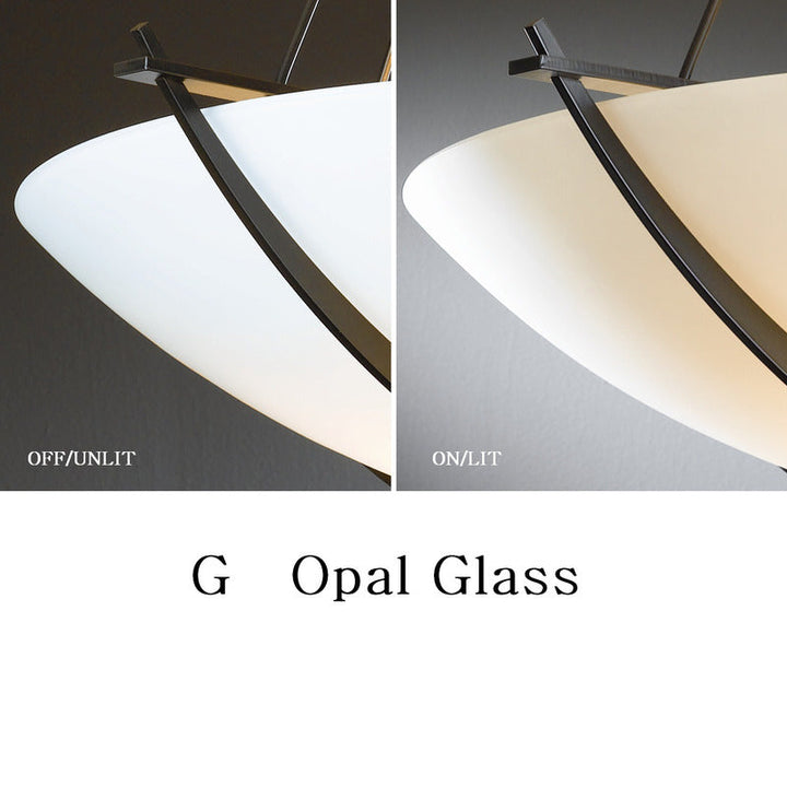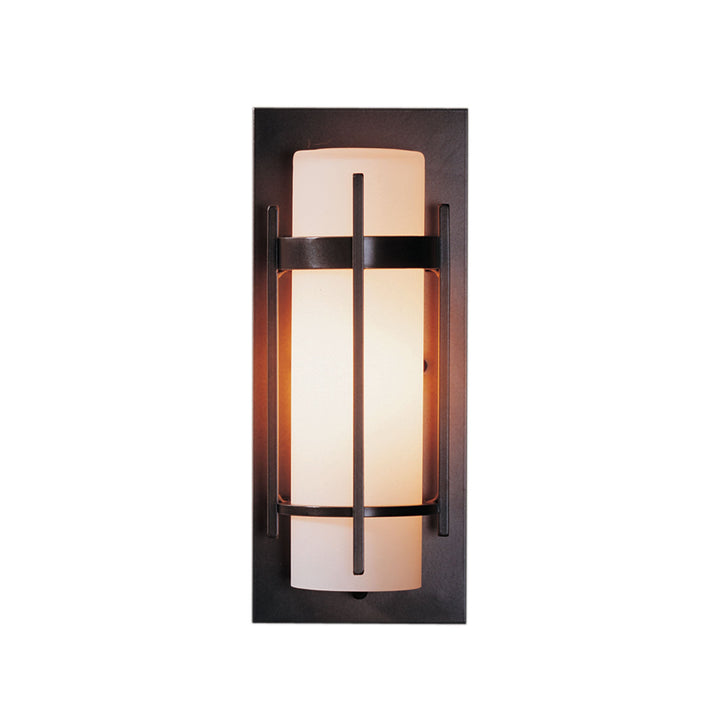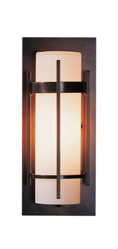 A clean, sleek design that evokes dreams of the Far East is the hallmark of Hubbardton Forge's Banded Collection. True to name, two handcrafted metal bands, intersected by a bold, vertical bar, encircle the glass and fasten to an aluminum plate.