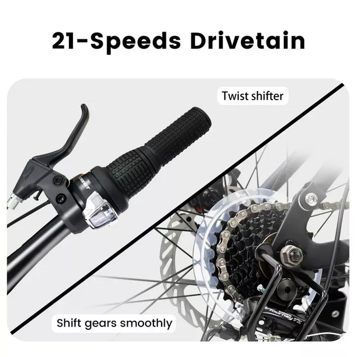 ⚙️ 21-Speed Gear System – Smooth-shifting drivetrain allows precise speed control on various terrains, ideal for both trails and daily commuting.