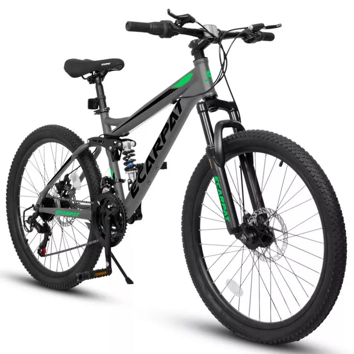 Tackle rugged terrain and urban streets alike with the BestParts 24 Inch Dual Suspension Mountain Bike, built for both teens and adults who demand durability, control, and style. Designed with a high-carbon steel frame and reinforced structure, this bike offers lasting strength for challenging commutes or weekend trail adventures. Its dual suspension system—featuring front fork and rear spring shock—efficiently reduces vibration and absorbs impact for a smoother, more comfortable ride on bumpy roads and rocky paths. The 21-speed drivetrain with a gear indicator lets you easily shift through various speed levels, whether climbing hills or cruising flat surfaces. For added safety and confidence, the bike comes with front and rear mechanical disc brakes, offering reliable and responsive braking power in all weather conditions. The 2.4-inch wide tires (24x2.125) provide excellent grip and control on dirt, gravel, and paved paths. This mountain bike includes a tool kit, assembly instructions, and comes 85% pre-assembled—just install the handlebar, pedals, saddle, and front wheel. With a 250lb load capacity and ideal height fit for riders 4'9" to 5'4", it’s the perfect all-terrain bicycle for school, commuting, or trail riding. Whether you're exploring nature or getting to class, the BestParts MTB is the ride you can count on.