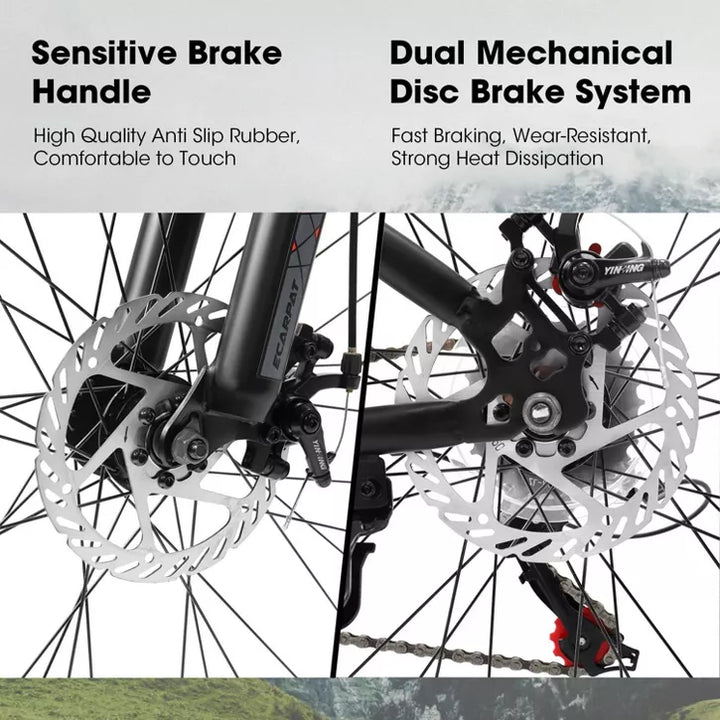 The BestParts 27.5" Mountain Bike in sleek Black+Red is built for adult riders who crave both performance and style. Constructed from high carbon steel, this MTB offers enhanced durability, perfect for navigating rugged trails or handling the rigors of daily commuting. Equipped with powerful disc brakes, the bike ensures responsive stopping power in all weather and terrains, keeping your rides safer and more controlled. Its wide 27.5x2.125β brown-edged tires not only provide excellent traction and shock absorption but also add a modern and rugged aesthetic to your adventure. With a 21-speed Shimano derailleur system and ergonomic flat handlebars, riders can shift smoothly across varied inclines and surfaces. The trigger shifter offers a precise and responsive control experience, ideal for both city riding and outdoor exploration. The bike comes 85% pre-assembled with a full toolkit and clear instructions, making setup easy. Whether youβre commuting, training, or simply enjoying the weekend outdoors, this 27.5β BestParts MTB is your go-to companion for reliable performance and bold design.