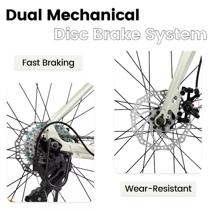 🛑 Responsive Disc Brakes-Front and rear mechanical disc brakes offer powerful stopping power and enhanced control in any weather condition.