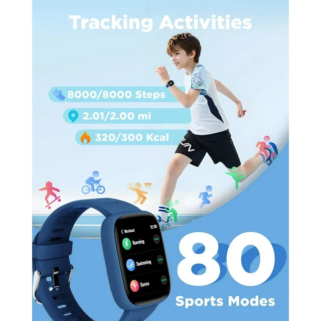 - All-Day Activity Tracking: BIGGERFIVE BRAVE 2 Smart Watch for Kids Teens Automatically counts steps, distance, calories burned, and active minutes. Supports 80 sports modes like walking, running, cycling, swimming(IP68 Waterproof), basketball, and more.