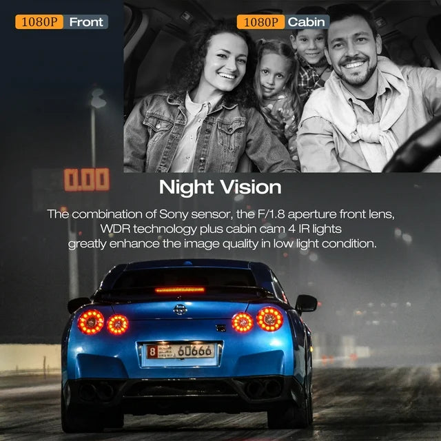 🚗Dash Cam with Infrared LEDs Night VisionEquipped with 4 LED infrared night vision lights, the camera car dash camera can record clear videos before and after even in a dark environment. The F2.0 lens in the cabin is plated with 6 layers of glass to effectively increase the light transmittance. Automatically balance the light and dark areas of the video to record stunning license plates and road signs.