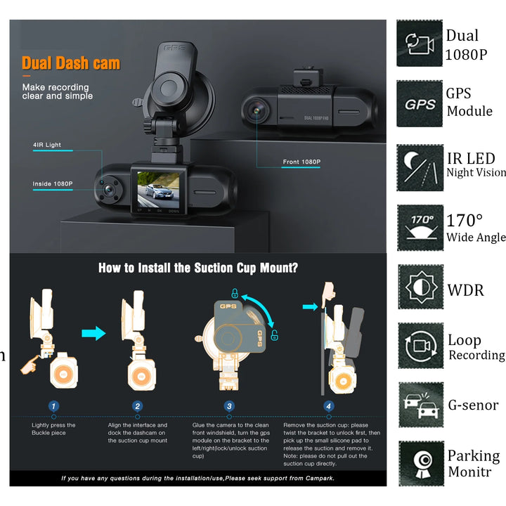 TOGUARD FHD 1080P Dual Dash Cam Night Vision Front and Rear Car Camera Car Dash Cam with mini design, compact but multi-functional. This dash cam has a built-in GPS tracker, which automatically captures and records the vehicle's location, driving speed, route and other information for you to play on HIT GPS Player on your PC. The F2.0 6-glass dual lens of this dual dash cam can restore vivid scenes even in low light, including license plates and traffic signs. The front and rear dual-lens dashcam records the front and interior at the same time at 1920x1080P@30fps, especially the driver-facing camera inside the car with infrared night vision can cope with low-light conditions, ensuring perfection even when the cabin is dark at night Video clips, which provide more detailed evidence, double guarantee the safety of drivers and passengers. In addition, this driving recorder supports continuous loop recording, and has a built-in 300mAh battery for parking monitoring, and a G sensor for accident emergency lock. Suitable for Uber/rideshare/Lyft/taxi/SUV/Jeep/truck drivers or people who need to record scenery and spend happy time with family during road trips, or shoot vlogs anytime and anywhere.