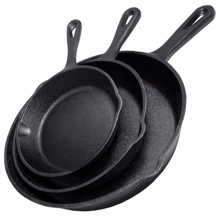 - 3 Skillets, 3 Sizes: Get more for your money with this 3-piece cast iron skillet set. Enjoy an 6-inch, 8-inch and 10-inch pre-seasoned round cast iron pan for meeting different needs!