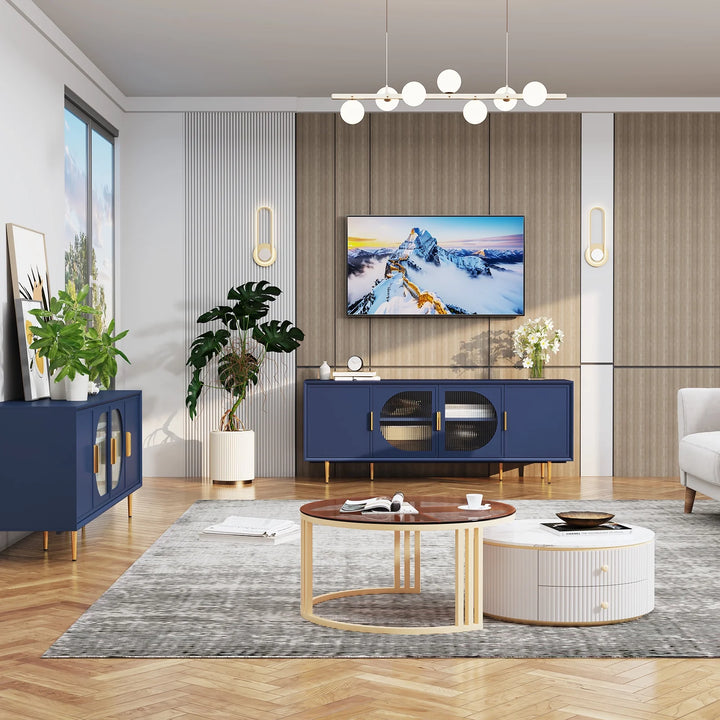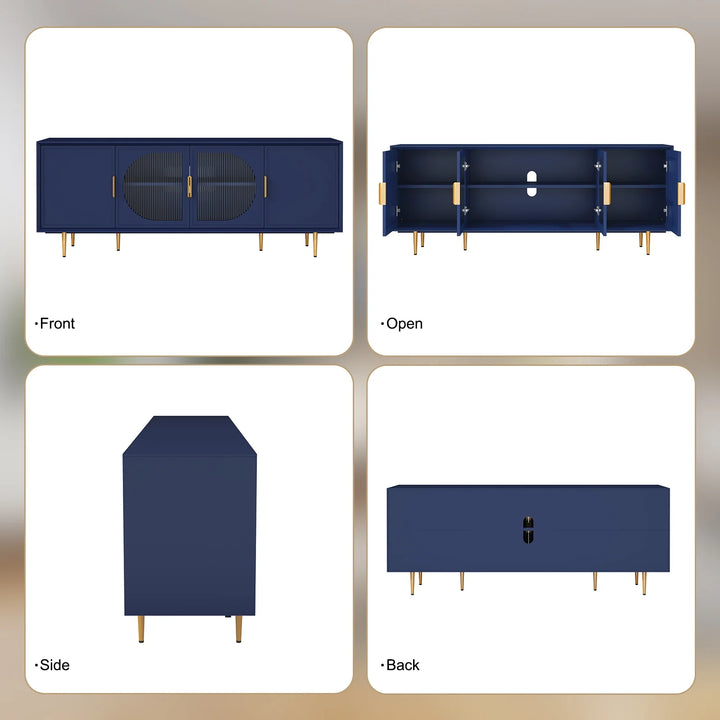 Specifications - Main Colors: Green / Blue / Black/White - Material: High-density wood with metal alloy handles - Style: Contemporary minimalist design - Dimensions: 66" (L) x 15.7" (W) x 25" (H) - TV Compatibility: Accommodates flat screens up to 75" (32"-75" models) - Functionality: TV stand / media console / modern entertainment center - Assembly: Tool-free setup with labeled parts and step-by-step instructions