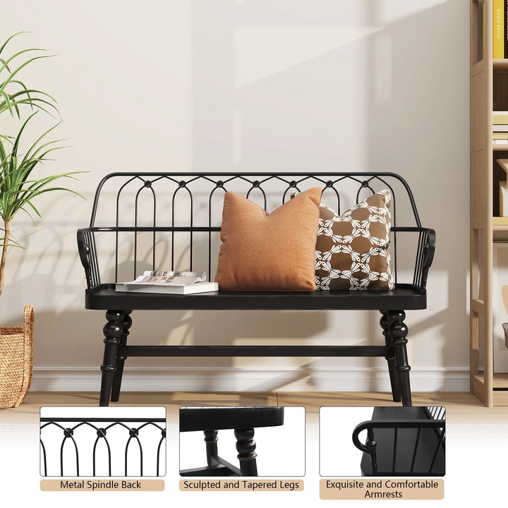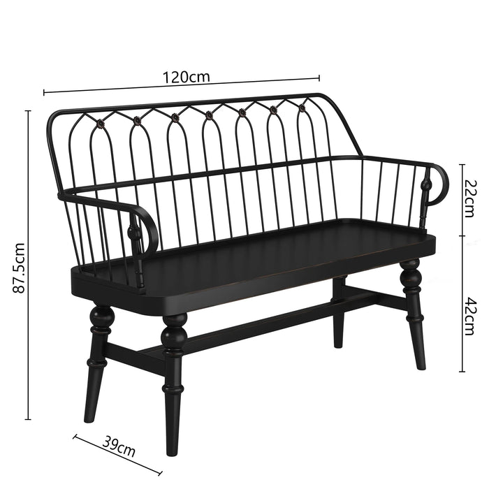 Built This settee is made of iron and 4 solid wood legs. This heavy-duty bench features a supportive backrest and armrests for comfort. The 500 lb weight capacity and H-shaped base ensure stability, safely accommodating 2-3 adults - ideal for hallways or small entryways.