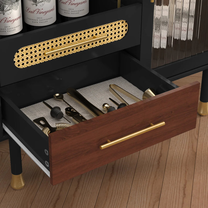 CBJCBJ This coffee bar cabinet adopts three-color stitching and adds gold metal decoration to the black cabinet surface and the original wood-colored drawers, which brings a noble and elegant atmosphere to the whole. It is a good choice to place it in the living room, kitchen, and dining room. The retro wood-grain drawers and corrugated glass door panels are a perfect fusion of medieval retro and modern styles. Putting wine and high-foot wine glasses in this wine cabinet will fully show your style of life. If you are also keen on collecting red wine, you want to put a decorative wine cabinet at home that matches your collection of wine. This will be a good decorative storage wine cabinet for your family. This cabinet can also be used as a coffee bar cabinet. Whether it is for storage or home decoration, it will be your best choice.