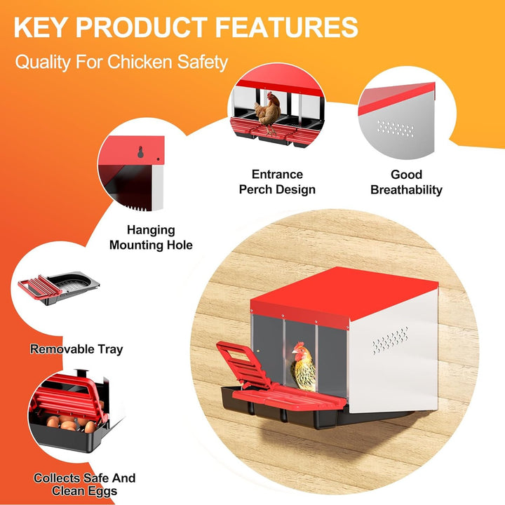 Chicken Nesting Boxes, 3 Hole Metal Chicken Egg Laying Box with Swing Perch and Rollout Egg Collection for Chicken Coop
