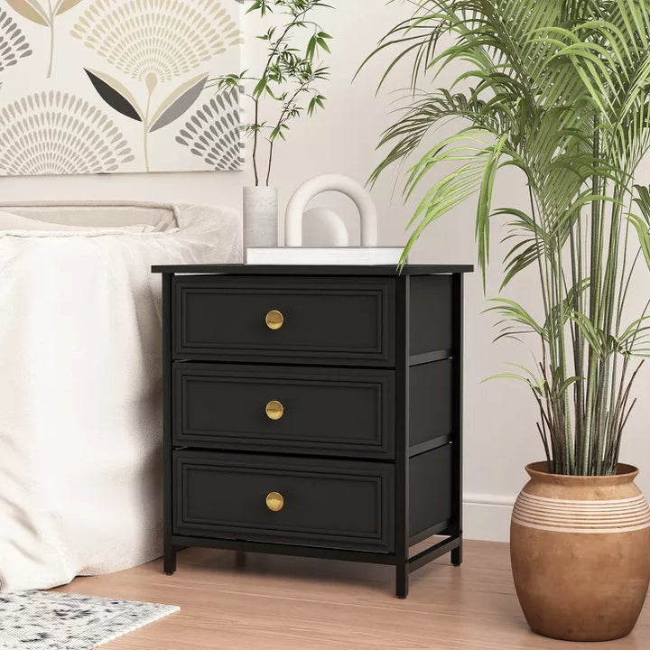This black cabinet with gold metal handles & black metal legs has a modern noble look (soft white + low-key matte gold hardware); 3 closed drawers offer dust/moisture-proof storage for items to keep rooms tidy, made of high-quality MDF, non-woven fabric & sturdy metal legs