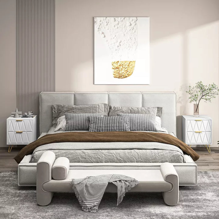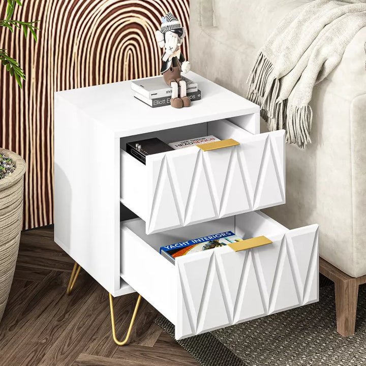 Upgrade your space with our 2-Pack White&Gold Nightstands! Boasting mid-century modern charm, their 35mm 3D carved drawers stand out from the rest. Crafted with durable, scratch/water-resistant MDF, plus dust-proof metal parts and silent drawer slides—built to last. Versatile for bedroom, living room, or balcony. Easy to assemble (tools + instructions included), with 24/7 customer support. Chic, practical, and ready to elevate your home!
