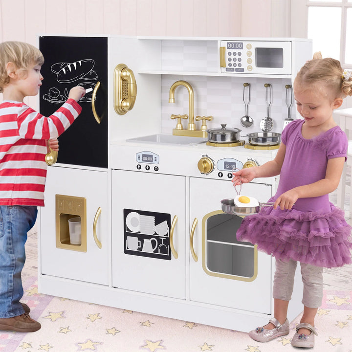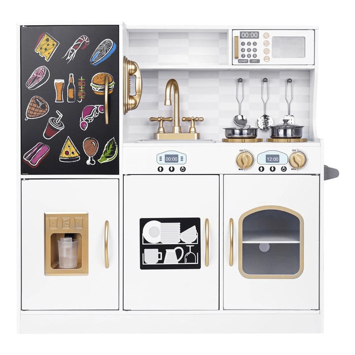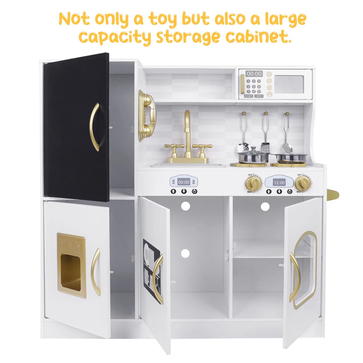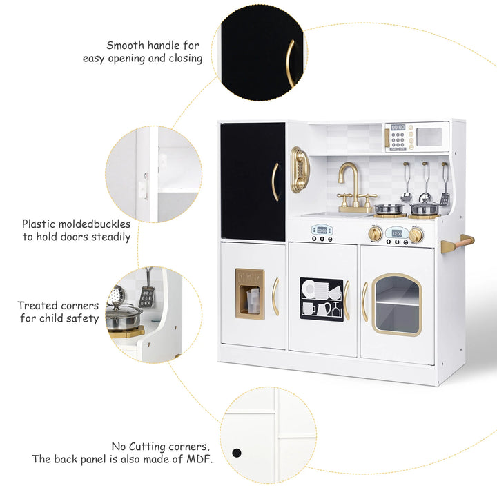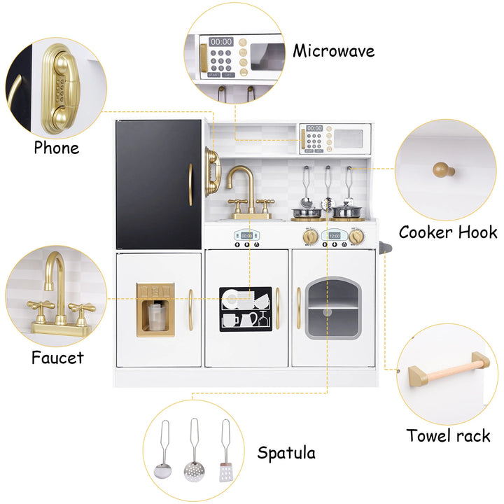 【REALISTIC PRETEND PLAY KITCHEN SET】: Discover endless fun with our wooden play kitchen! Kids can jot down orders on the blackboard, ignite their creativity with a sound-making stove switch, and cook with food-grade utensils. Equipped with a real-like ice machine, faucet, sink, microwave, and more, it offers an authentic culinary experience for children.