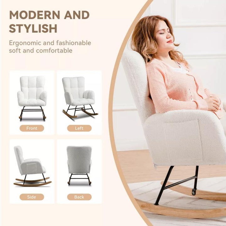 COMHOMA Modern Nursery Rocking Chair, Teddy Upholstered Glider Accent Chair with Side Pockets, High Backrest