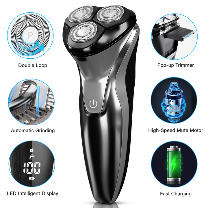 - 【Precise and close, flexible blades】The electric shaver's four-way floating head fits the contours of your face for a clean, close shave, and with its unique dual-track ultra-thin spherical grid and self-sharpening steel blades, it ensures a fast, precise shave that adapts to different areas. Designed for men who need a fast and efficient shave, it boosts confidence and saves time.