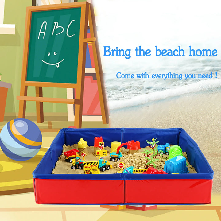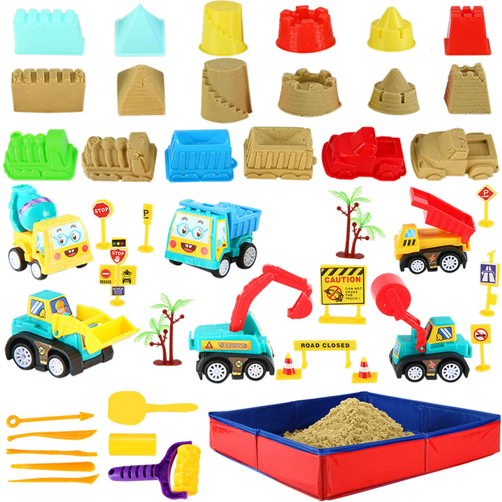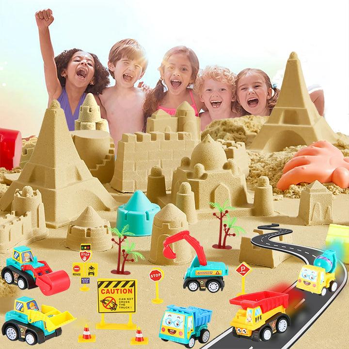 - 【EVERYTHING YOU COULD EVER NEED】Why give the gift of regular, boring toys when you could have the giant construction moving sand kit which contains everything you need to keep boys and girls occupied for hours! Kit is made of 2lbs sand, 6pcs pull back construction truck, 9 cool castle & car molds, 10pcs road signs, 11 sand tools.Oh, and don't forget the foldable portable sandbox.