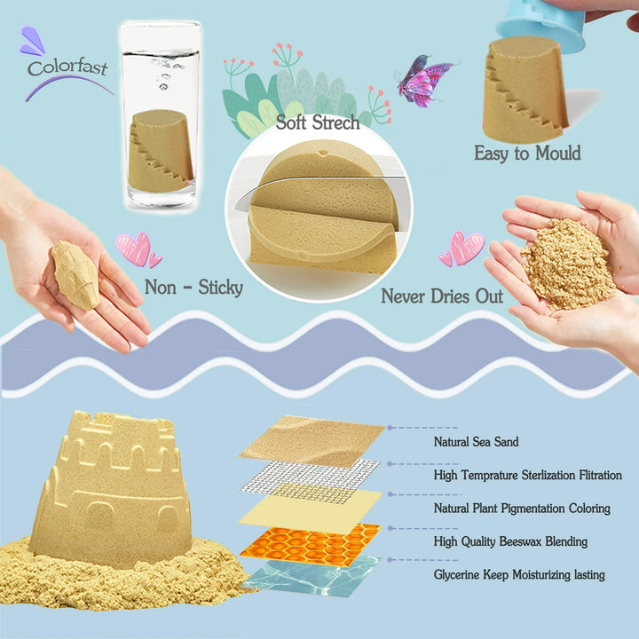 - 【BRING THE BEACH HOME】Come and bring the beach home but never worried mess as for the sand just feels like wet beach sand but won’t stick to anything but itself. Come on and give your kids a surprise gift which including everything you need while playing the sand