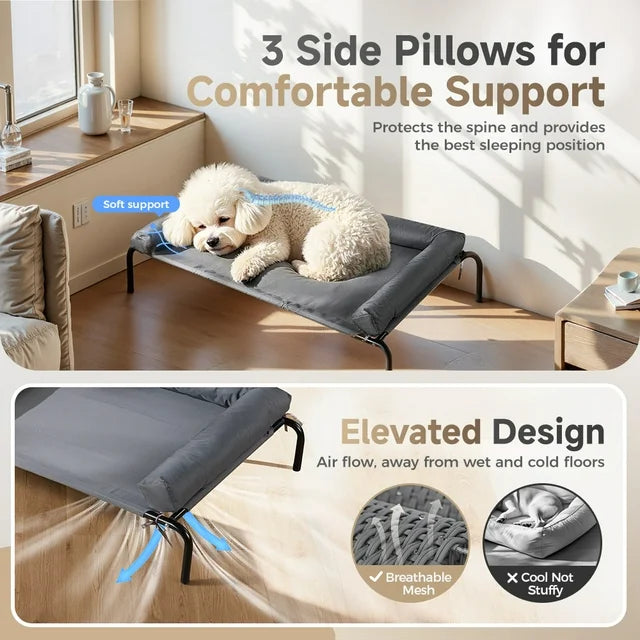 DOMIPET Cooling Elevated Dog Bed with Removable Pillow-Top Mat, Bolster Dog Cot Bed, Raised Pet Cot with Breathable Mesh, No-Slip Feet, Dog Sofa Bed for Indoor & Outdoor, Gray