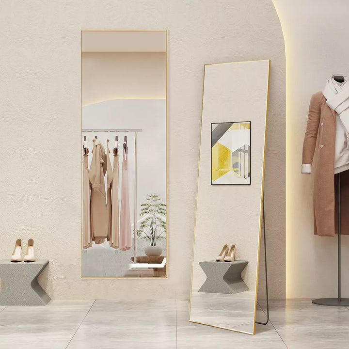 DOMETOUR Full Length Mirror! This elegant rectangular mirror features a luxurious gold frame, perfect for adding a touch of sophistication to any room. Whether used as a standing floor mirror or wall-mounted, it complements various decor styles effortlessly. The high-quality reflective surface ensures a clear and accurate image, ideal for wardrobe checks or enhancing natural light within your space. Easy to install and crafted for durability, this mirror is both a functional and stylish addition to your home.