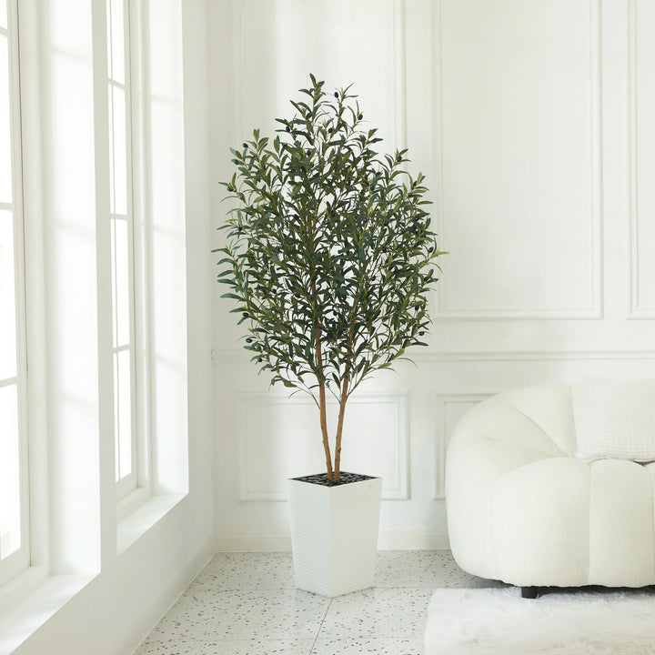 Bring timeless Mediterranean elegance to your space with this 6-foot DR.Planzen Artificial Olive Tree. Perfect for busy homeowners, our UV-resistant silk leaves shimmer with lifelike detail while requiring zero watering or sunlight. The authentic wood trunk anchored in a sleek 15.7" tall planter adds organic warmth to modern interiors. Weighing just 18.7lbs, effortlessly position this faux tree in sunrooms, office lobbies, or covered patios. Its full canopy stays vibrant through seasons - ideal for holiday decorating or year-round greenery.
