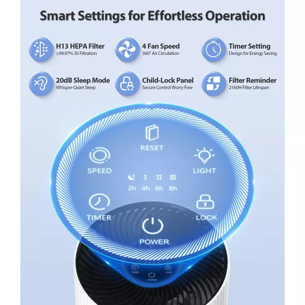 Say goodbye to stale air and hello to pure, refreshing breaths with our advanced 3-stage H13 HEPA air purifier! Designed for homes, offices, and bedrooms, it removes 99.97% of dust, Air Purifiers for Home Covers Up to 1500 sq ft,smoke, pollen, pet dander, and odors, Silent Night Mode (20dB)capturing particles as tiny as 0.3 microns—so you and your loved ones breathe cleaner, healthier air every day.