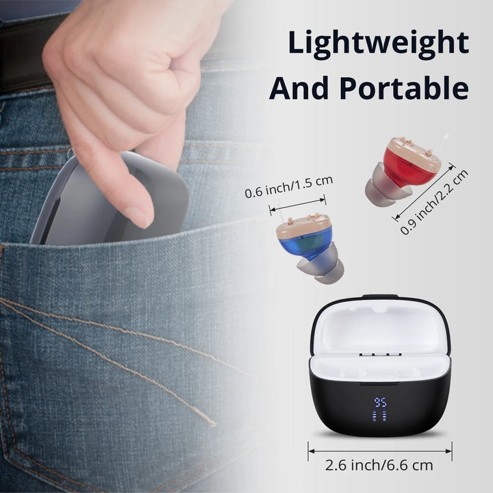 The hearing aids are ultra-lightweight and virtually invisible, with 6 silicone ear domes (3 sizes included) for a secure, irritation-free fit.