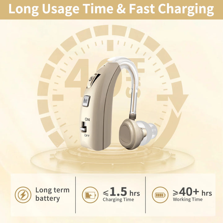 The ‌Hearing Aid's‌ ergonomic, hypoallergenic design ensures a secure fit for all-day comfort, with three silicone ear tip sizes (S/M/L) included. The ‌USB-rechargeable battery‌ delivers 30+ hours of ‌Hearing Aid‌ use per charge.
