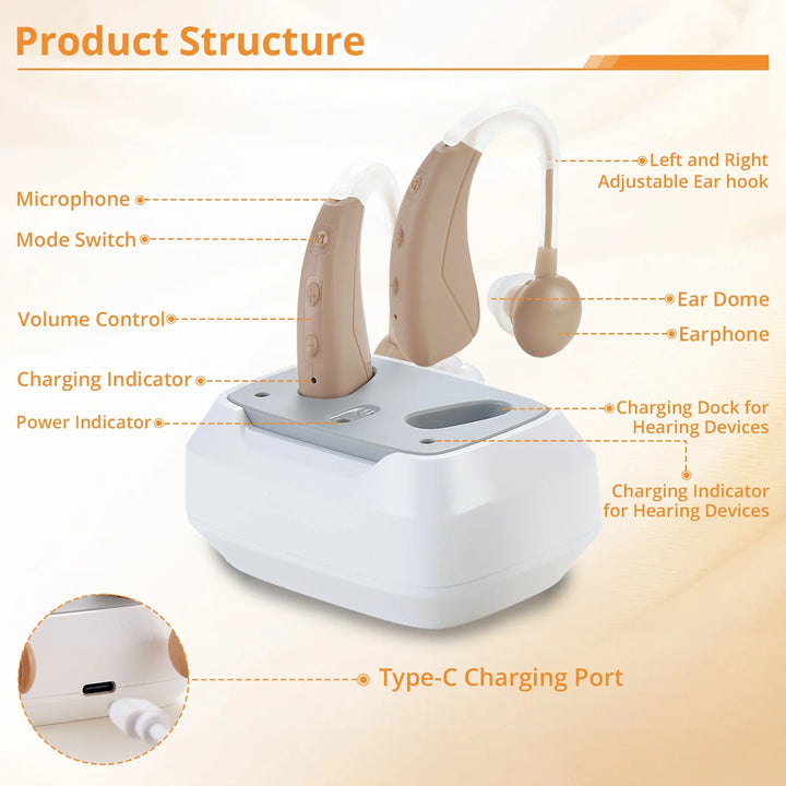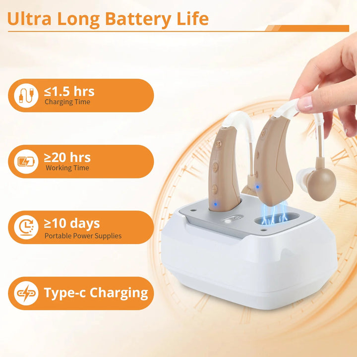 Say goodbye to dead batteries! These rechargeable hearing aids deliver up to 20 hours of uninterrupted use on a single charge. The included compact desktop dock powers your devices from 0% to 100% in just 90 minutes. Perfect for busy days, travel, or emergencies—always ready when you need them.