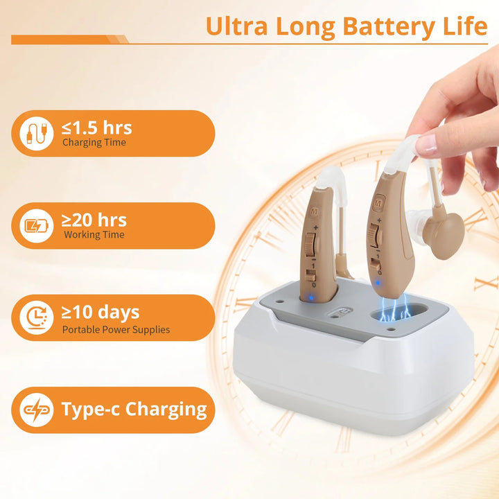 Say goodbye to dead batteries! These rechargeable hearing aids deliver up to 20 hours of uninterrupted use on a single charge. The included compact desktop dock powers your devices from 0% to 100% in just 90 minutes. Perfect for busy days, travel, or emergencies—always ready when you need them.