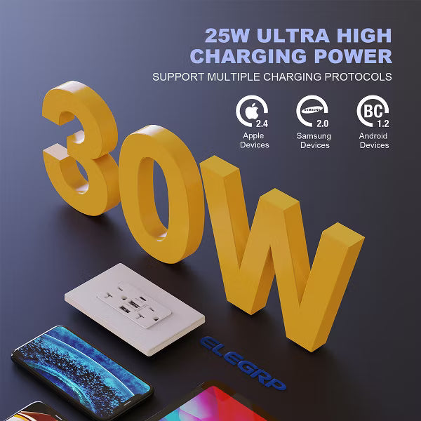 30-Watt 20 Amp 3-Port Type C and Dual Type A USB Duplex Wall Outlet, Wall Plate Included