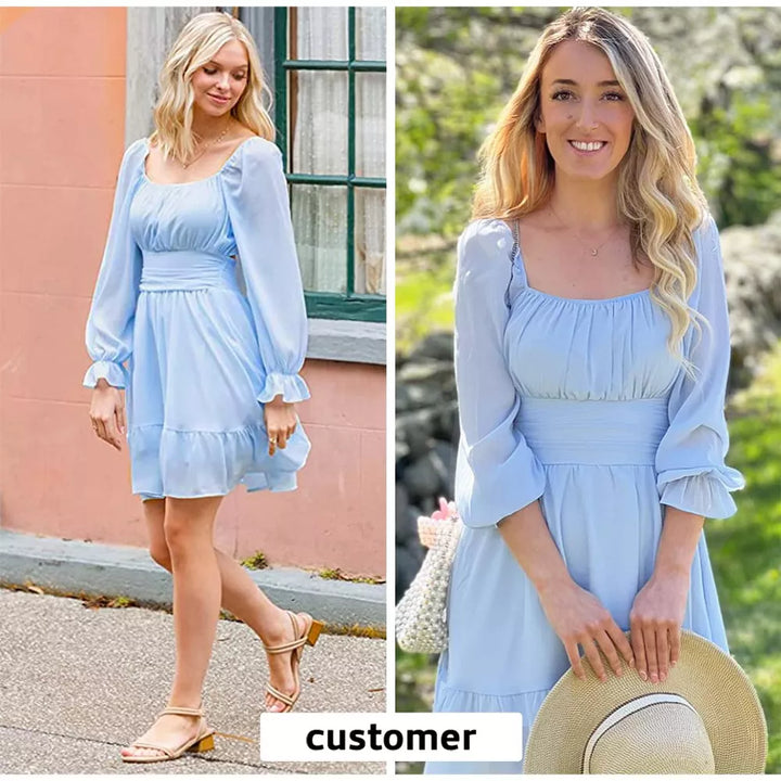 The EXLURA Women's 2025 Casual Mini Dress is a stylish and elegant choice for any occasion. Designed with long lantern sleeves, it adds a touch of sophistication while ensuring comfort. The square neckline enhances femininity, making it a flattering option for different body types. Featuring ruffle details and a tie-back design, this dress offers a chic and playful aesthetic. The elastic waist provides a comfortable and adjustable fit, accentuating the body's natural shape. With its A-line silhouette, the dress flows beautifully, allowing ease of movement. Perfect for casual outings, parties, or date nights, this short mini dress combines fashion and functionality effortlessly. Made from high-quality fabric, it ensures softness and breathability throughout the day. Available in multiple colors, this trendy dress is a versatile addition to any wardrobe. Pair it with heels for an elegant look or sneakers for a relaxed vibe. Whether dressing up or down, the EXLURA 2025 dress is a must-have for every modern woman.