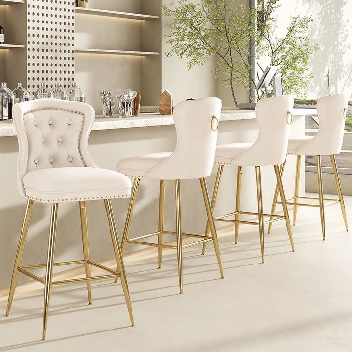 Elevate your space with the Bar Stools, a perfect blend of luxury and functionality. Featuring plush velvet upholstery, sleek metal legs, and elegant button-tufted detailing with nailhead trim, these stools are ideal for your kitchen island, dining room, or pub. The generously padded cushions offer exceptional comfort, while the sturdy construction ensures durability, with a weight capacity of up to 300 pounds. With a 26-inch seat height, these stools are designed to fit most kitchen counters ranging from 34 to 38 inches, making them both practical and versatile. Whether hosting guests or relaxing, these stools deliver style, comfort, and reliability for any setting.