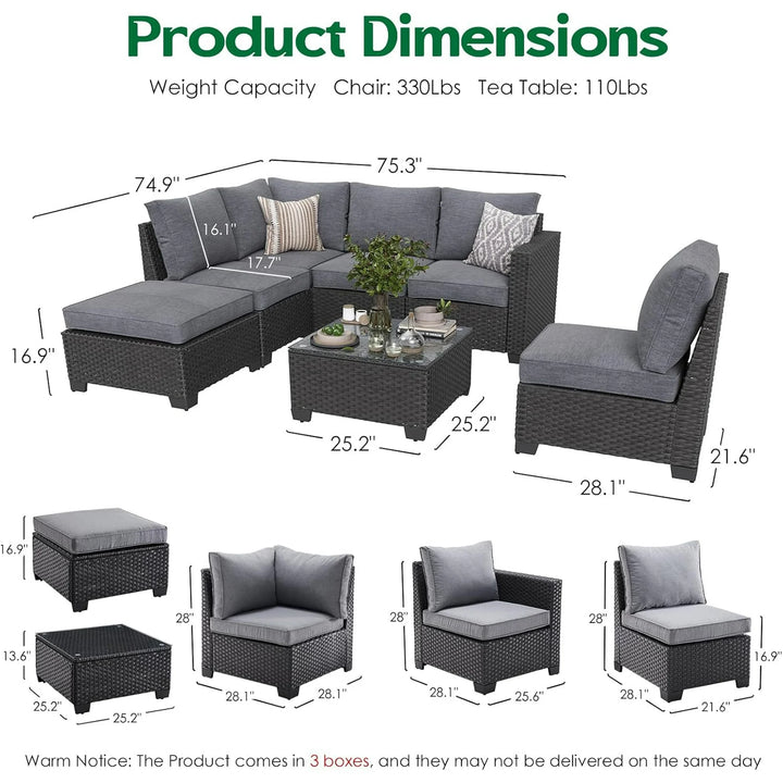 Farini Outdoor Wicker conversation sets, 7 Pieces Patio Furniture Sofa Set with Coffee Table, All Weather for Garden, Backyard, Balcony (Dark Gray)