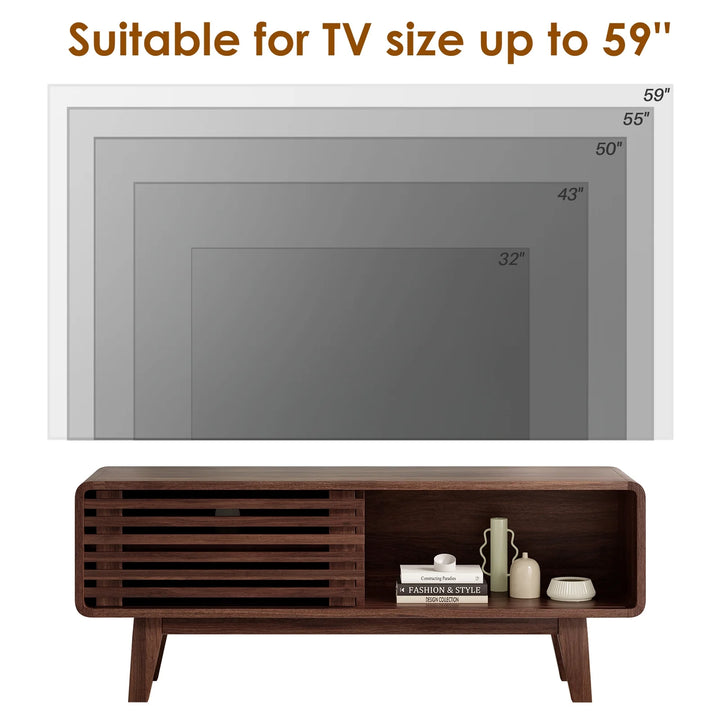 Bring mid-century modern charm to your space with this compact yet functional 59" TV stand, designed specifically for smaller living rooms and apartments. The sleek design combines clean lines with practical storage, featuring smooth-sliding doors to hide media clutter and open shelves for easy access to frequently used items. Built with stability in mind, its reinforced frame safely supports TVs up to 59 inches while the scratch-resistant finish maintains its stylish appearance. Perfect for optimizing small spaces, this stand keeps your entertainment area organized without sacrificing style-ideal for bedrooms, dorms, or cozy living rooms.