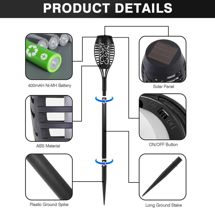The flickering outdoor lights are made of high quality and durable IP65 Waterproof ABS material, thus withstanding all kinds of weather, allowing you to enjoy the dancing flames all around the year. That is why our solar powered torch lights are perfect for outdoor use, acting as a beautiful decoration lighting for your garden, pathway, driveway, backyard, etc.